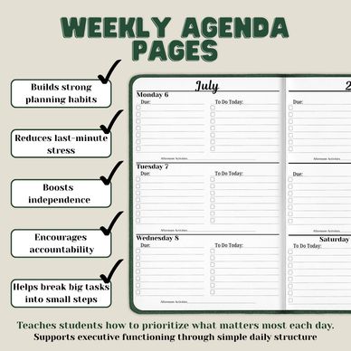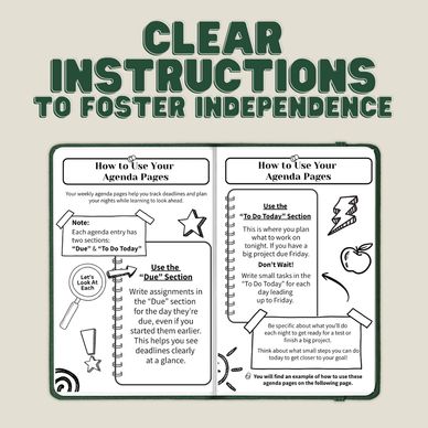 Clear instructions to help students learn how to effectively use the planner independently. A QR code is also at the front of the planner which will link to videos that walk through ways to utilize the planner to its max!